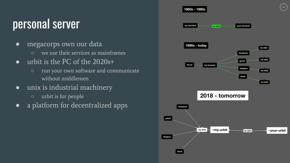 urbit is a personal server. that is to say, it’s a computer acts as an agent on your behalf to talk to other computers on the internet. right now, we all use computers that belong to megacorporations and serve their interests; when you log into facebook and talk to your friend, all the real computation and storage is done on servers that belong to facebook. in a very real sense, they own your data. it’s very difficult to avoid at this point. the goal of urbit is to address the technical issues that led to this state of affairs, so that everybody can run and control their own software. there are a lot of projects that have tried to address one or two of the many problems that urbit tries to solve, but i doubt there is any other current project as ambitious or farsighted. urbit is an open source project primarily developed by a company called tlon, in san francisco, and there’s another company in austin also working full-time to develop it, called urbit.live.
