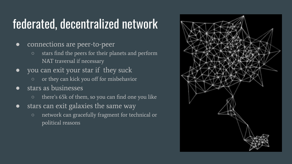 to briefly recap the design of the network, at the top of the routing hierarchy are galaxies, which sign software updates for all the ships below them and issue stars. the star is expected to perform peer discovery and nat traversal for the planets beneath it. stars can issue planets, which are meant for people. the connections your server makes with your friend’s are directly peer-to-peer where possible, and mediated by a star when it isn’t.