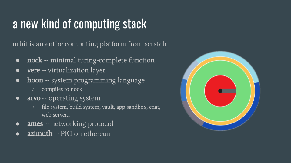 urbit is famously difficult to describe; this is due to a combination of complexity, an opaque naming scheme, and its genuinely novel ideas and clever recombinations of old ones. it can seem like it leaked into our world from an alternate timeline. thinking about urbit requires you to modify a lot of conceptual models that you’re used to using to think about computers and the internet. i’m not any kind of expert on any on these subjects but i’ve spent a decent amount of time trying to digest the technical parts of urbit, and my goal here is to convey that understanding to you, and connect the technical decisions and constraints to the problems being solved. this presentation is aimed at someone who has heard of urbit but doesn’t quite get it yet. so, to begin, here is a list of questions: