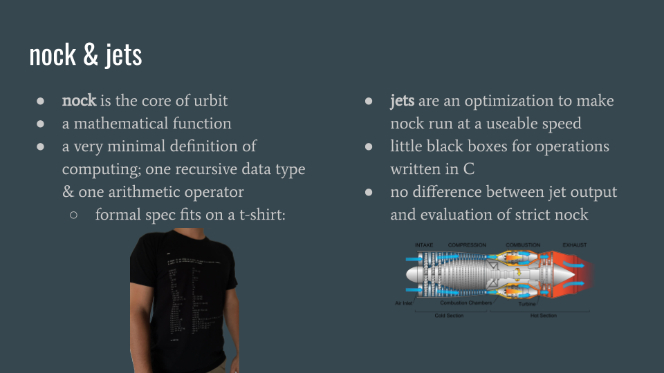 as you may know, if your computer can increment, you can derive all of the rest of the math you’d like out of that operation – for instance decrementing x by incrementing up to x-1. this is extremely inefficient, but urbit has a cool hack for this: the standard library has all the operations you would expect implemented as “jets”, written in optimized c, which manipulate values in a formally equivalent manner to a specification written in nock. that is to say, if you ran an incredibly slow version of your urbit without jets that did all its math the hard way but otherwise had the same inputs, its state would end up identical to the jetted version.