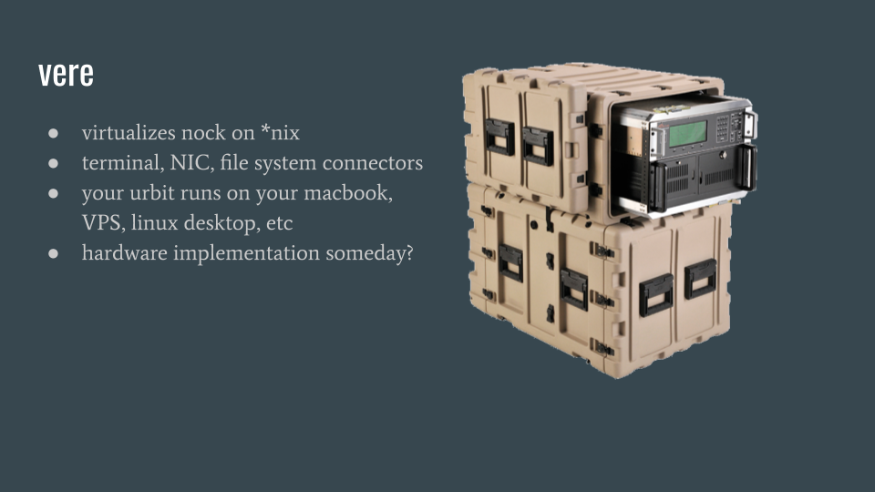 nock is virtualized with an interpreter programmed in c called vere. vere sits between your urbit and your computer, handing over keyboard and packet inputs to your urbit, and outputs back to your unix computer to be displayed in its terminal or sent off through its network interface. right now urbit runs as a unix process, but one can imagine urbit on hardware meant to run nock and jets directly. for now, vere is what runs your urbit on your macbook or vps.