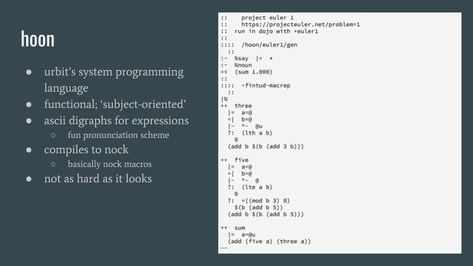 hoon is the system programming language for the urbit operating system, arvo. hoon is a strongly-typed, functional higher-level language that compiles to nock; it’s effectively a collection of nock macros. expressions are denoted with ‘runes’, which are digraphs of ascii special characters. hoon code is made up of these expressions and as a result can be kind of scary to look at, but i promise it’s not as hard to use as you may think!