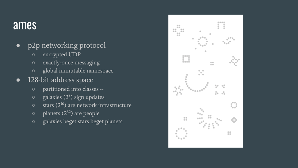 the urbit network protocol & kernel module is called ames. ames is peer-to-peer and encrypted, and runs over udp. it has a global immutable namespace; an instance’s name is permanent, and is both an identity and routing address.