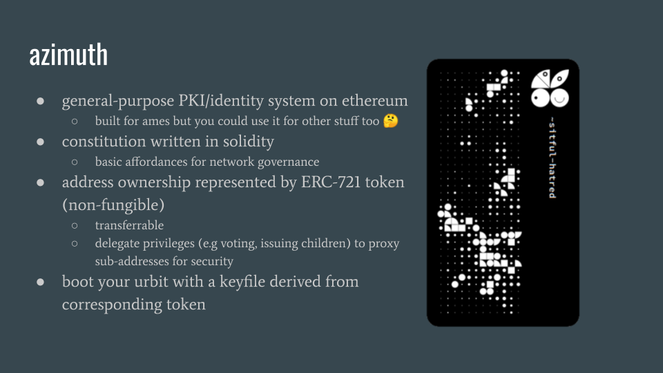 how do you own these names? urbit’s public key infrastructure is a set of ethereum contracts collectively called azimuth. azimuth acts as an ownership registry for ships and consensus mechanism for network governance. if you receive a ship, your proof of ownership is an erc-721 token, which is an ethereum standard for non-fungible tokens. you own this token like you own bitcoin; as long as you have the master password, it belongs to you forever.