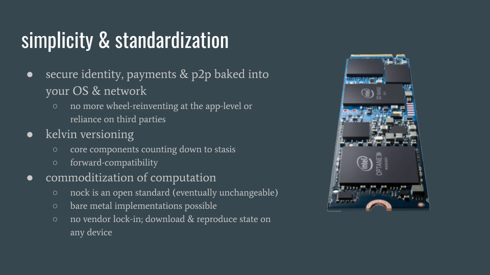 standardization also allows for commoditization. any computer that can run an urbit can run any other urbit and all its software. the platform is an open standard, which allows commodity providers to compete over performance without users being locked in or out by proprietary changes or interoperability problems. in practice, this will look something like urbit hosts running your instance on their hardware for a fee, but you being able to download your instance and all your data to run on another provider, or even your personal computer if you decide to do so. it can also look like hardware implementations of nock, and urbit-native computers manufactured by anybody who wants to, like pc clones.